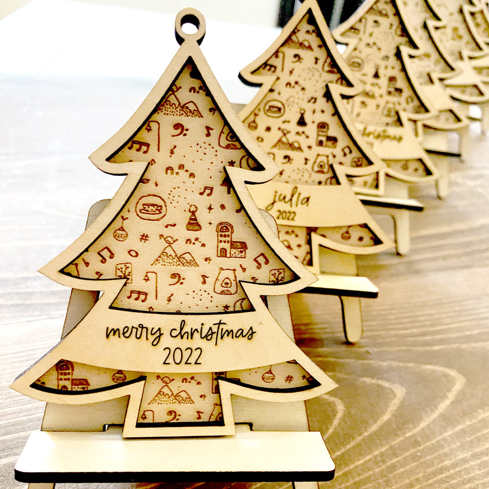 These beautiful Christmas tree wooden ornaments make wonderful Christmas gifts for your piano students and music friends. They come in two designs and can be personalized with student names or any text you like.