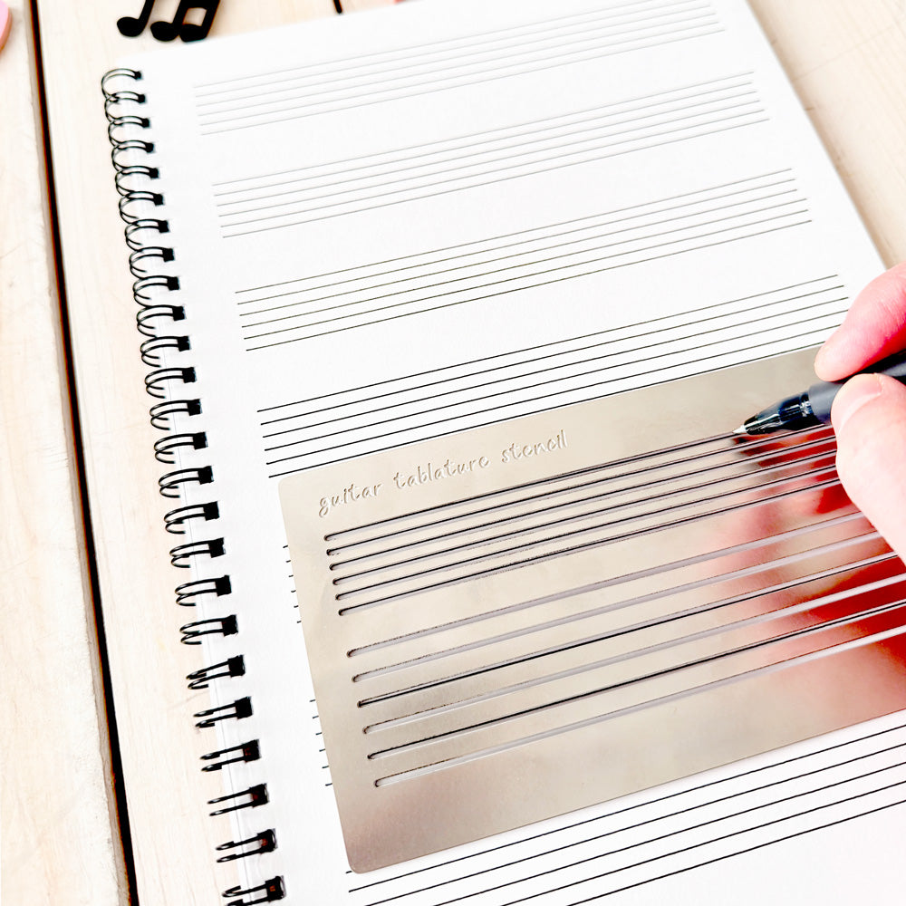 The Metal Guitar tablature Stencil gives you a guide for clean, straight lines perfect for a guitar tablature anywhere you need it for many teaching ideas.