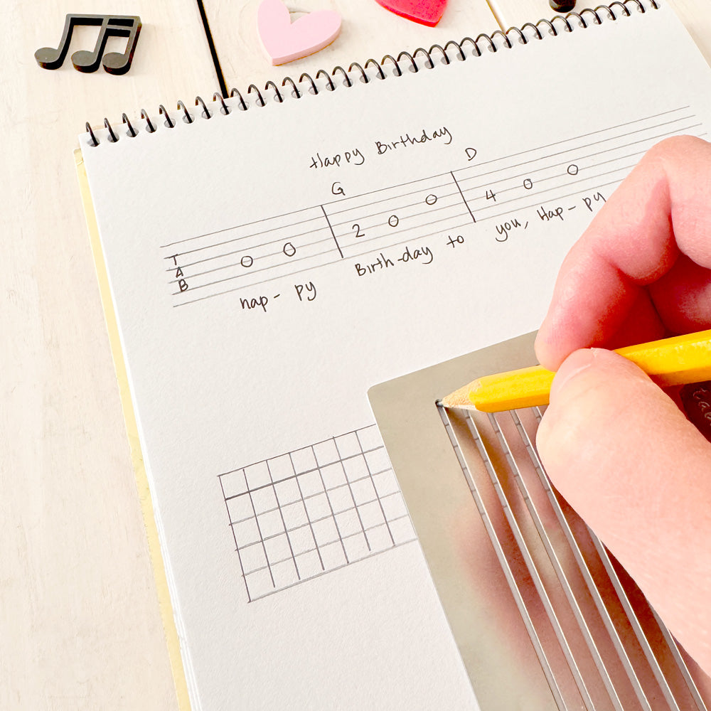 This metal guitar tablature stencil features 2 different guitar tablature sizes and is the perfect addition to your music studio. Trace the guitar tablature anywhere you need it for extra theory review or even craft uses.