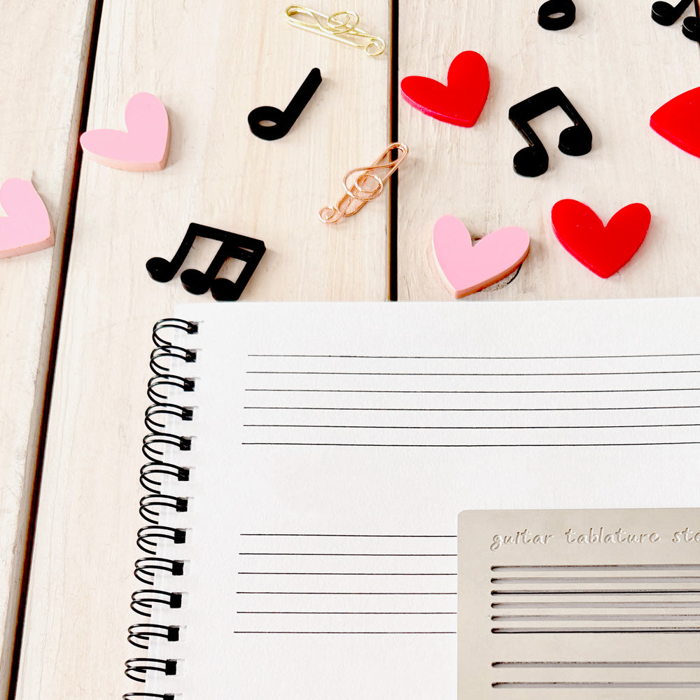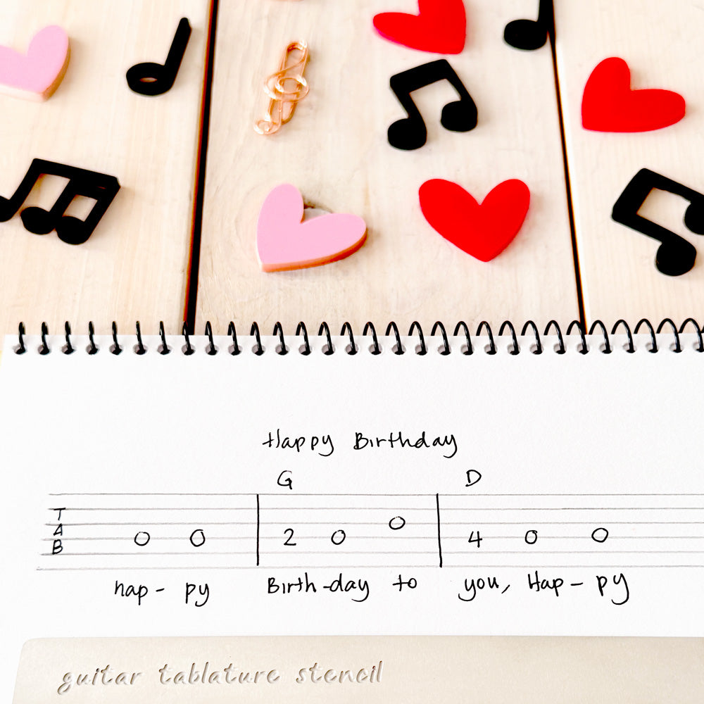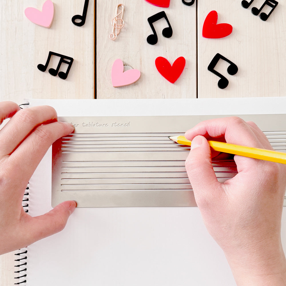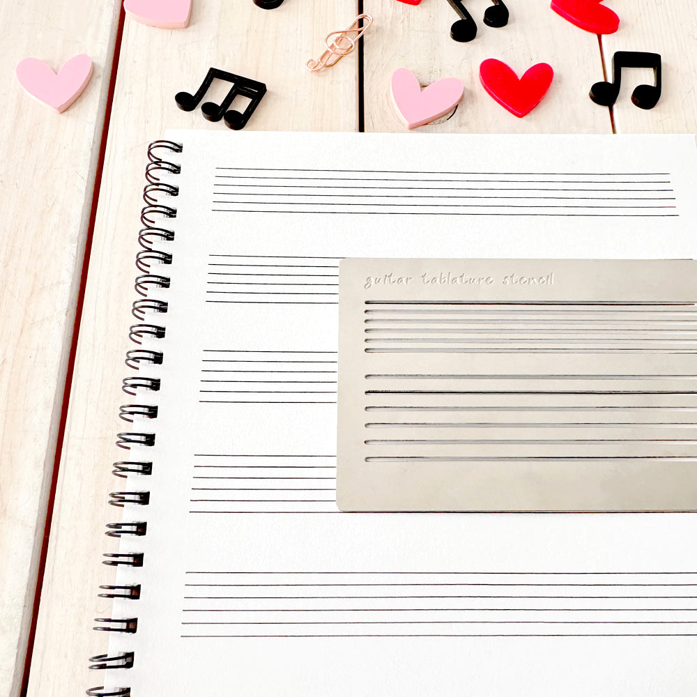 Use this Metal Guitar tablature Stencil in guitar assignment books, lesson books, scrapbooks, and on any other paper material. You will have a guitar tablature easily ready anytime you need it for teaching or craft ideas with a beautiful result. It’s easy to “trace a tablature” where needed and it only takes a few seconds!