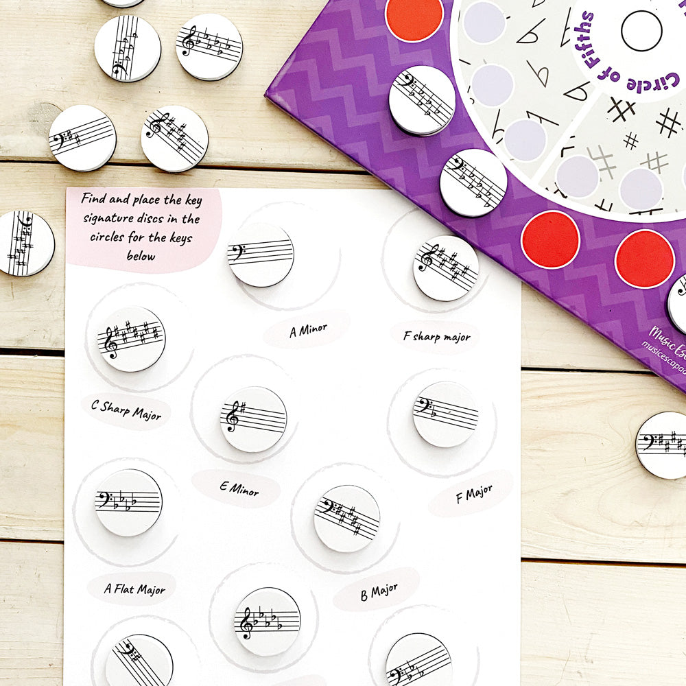 - For a group music class, divide the key signature discs evenly among students. Call out a list of random key signatures. The student who has the most corresponding key signature discs wins that round.