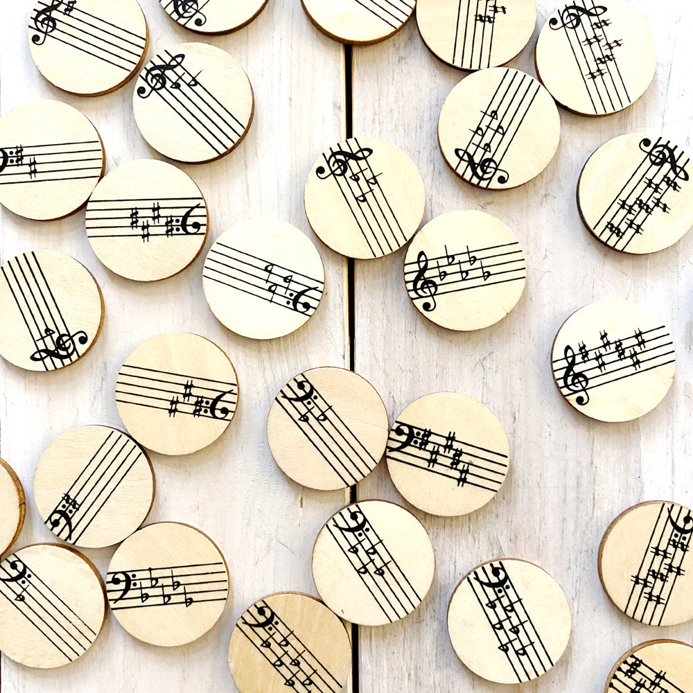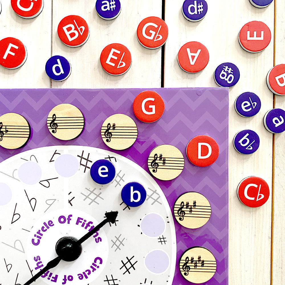 Wooden discs do not come with magnet backings. Attach a craft magnet to the back of each wooden disc to use on the Circle of Fifths magnetic board and add a fun activity/game with the magnetic spinner. See this blog post for more game ideas!